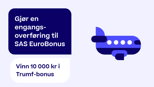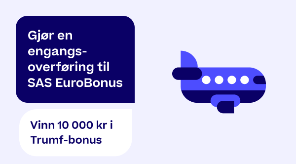 Gjennomfør en engangsoverføring til SAS EuroBonus fra og med 23. mars til og med 29. mars - og vær med i trekningen av 10 000 kr i Trumf-bonus! For å være med i trekningen må du overføre minst 200 kr i kampanjeperioden. Vinneren trekkes og kontaktes av Trumf kundeservice 30. mars.