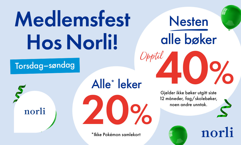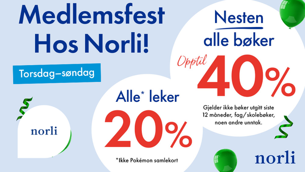 Torsdag til søndag har Norli medlemsfest med opptil 40% rabatt på nesten alle* bøker og 20% på alle leker unntatt Pokemon-samlekort for alle medlemmer av Norli PLUSS. Ikke medlem ennå? Du melder deg enkelt inn i kassen i Norli-butikker eller på norli.no. Husk at du som Trumf-medlem i tillegg sparer 1 % Trumf-bonus i Norli-butikker. *Tilbudet gjelder ikke bøker utgitt siste 12 måneder, bøker på salg, fag-/skolebøker og utvalgt lokallitteratur.