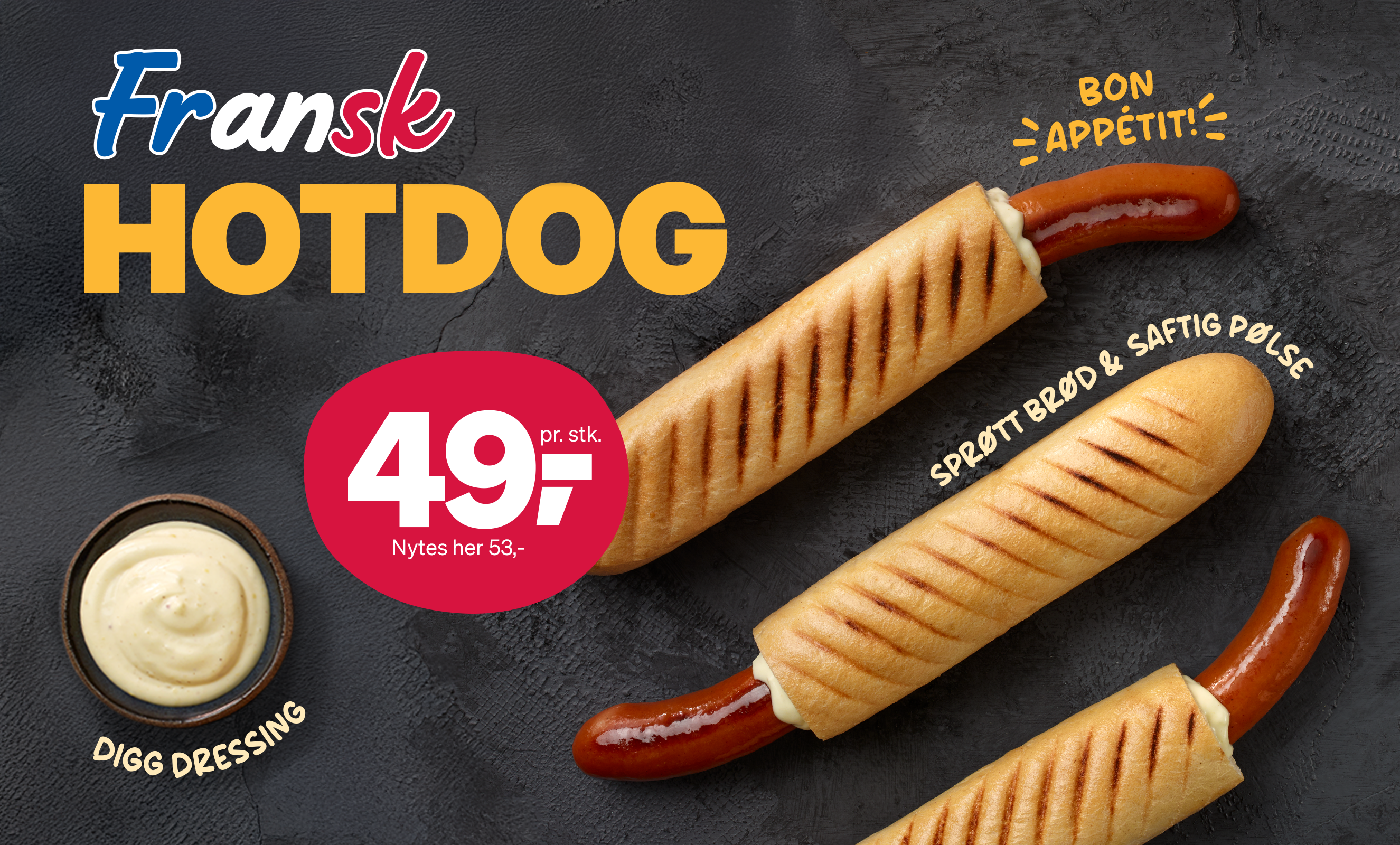Nå får du Fransk hotdog til kun 49,- perfekt når du trenger en liten pause på farten. Spøtt brød, saftig pølse og digg dressing. Enten du er på vei til jobb, hjem eller helgetur – stikk innom og unn deg en klassiker. Bon appétit!