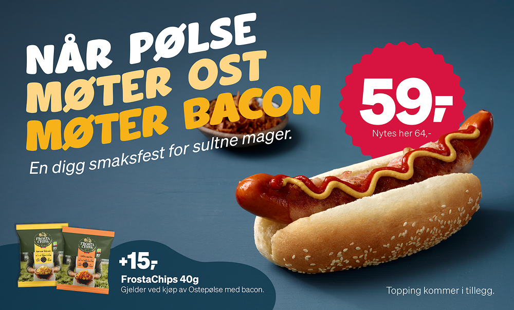Ta deg et velfortjent stopp hos Esso! Deres ost- og baconpølse kombinerer alt du elsker – saftig pølse, smeltet ost og sprø bacon. En skikkelig smakspause til kun 59,-. I tillegg får du FrostaChips 40 g for kun 15 kroner når du kjøper ostepølse med bacon!