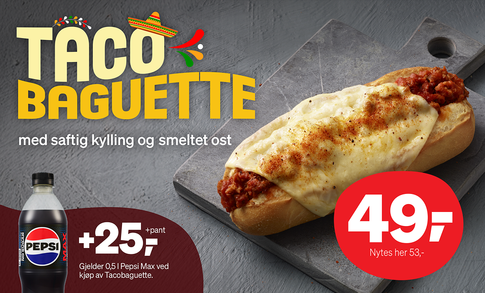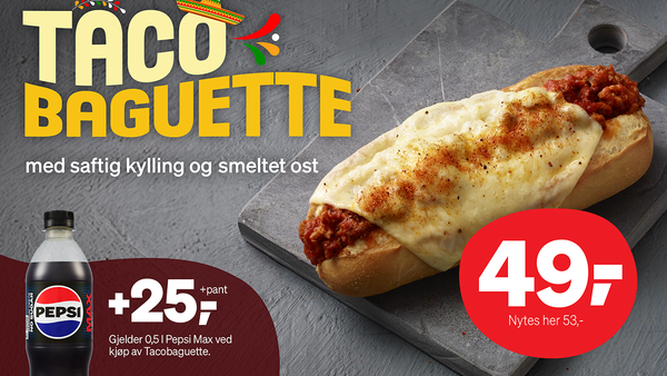 Nytt år betyr nye muligheter og en rykende fersk nyhet på våre stasjoner! Tacobaguette med saftig kylling og smeltet ost. Perfekt til frokost, lunsj eller om du trenger påfyll langs veien! I tillegg får du en 0,5 l Pepsi Max til kun 25 kr + pant ved kjøp av Tacobaguette.