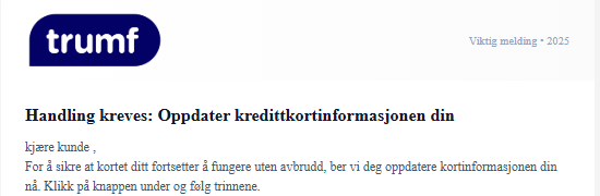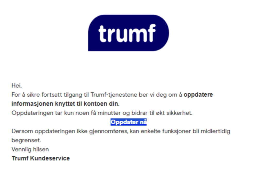 Vi har fått tilbakemelding om at flere kunder har mottatt e-post som angivelig skal være fra Trumf hvor man blir bedt om å oppgi BankID, kontonummer, oppdatere virusprogram, omhandler bitcoin eller at du har fått en pakke fra Express Postal. Dette er svindel!